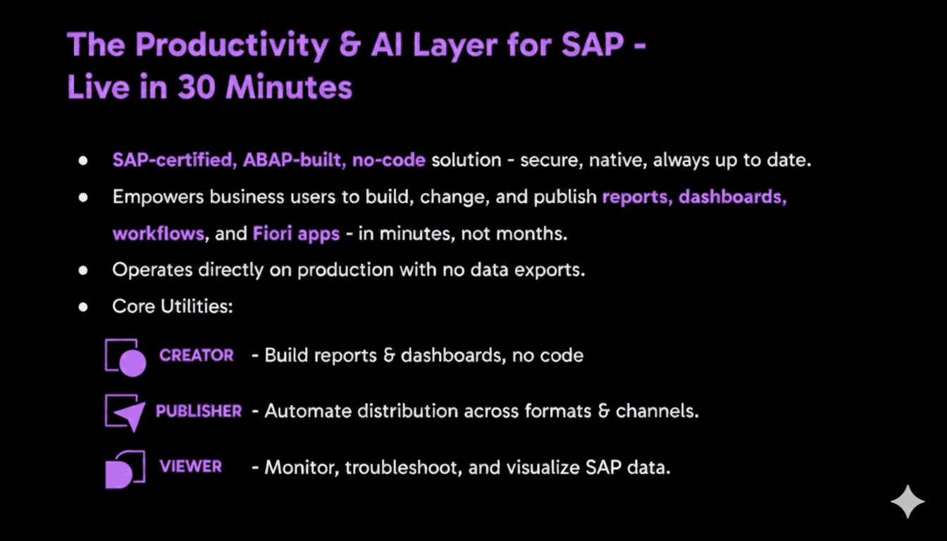 Enable business teams to answer 80% of their day‑to‑day reporting and analysis questions using live SAP data, without having to build, license, or maintain a separate data warehouse or complex BI infrastructure.